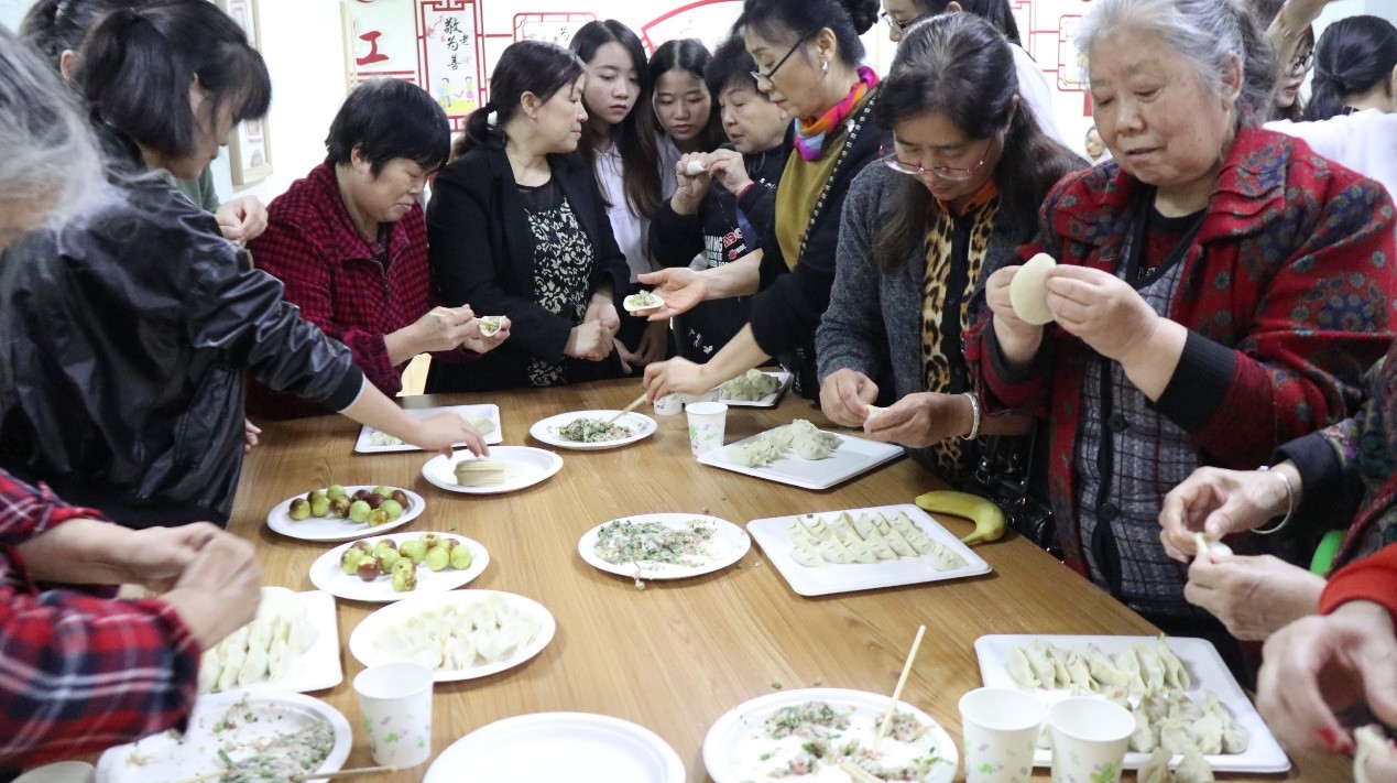 “看清楚了呦,两个手这样合十,用力一捏,喏,看吧,就搞定了!”奶奶一边包饺子对志愿者们说道。桌子周围围满了老人和志愿者,大家热情高涨,你一言我一语,七手八脚,互帮互助,不一会儿,一盘盘“各具特色”的饺子就摆满了整张餐桌。看到千奇百怪的饺子,爷爷奶奶们开心地说道:“饺子丑丑的,心里暖暖的”。