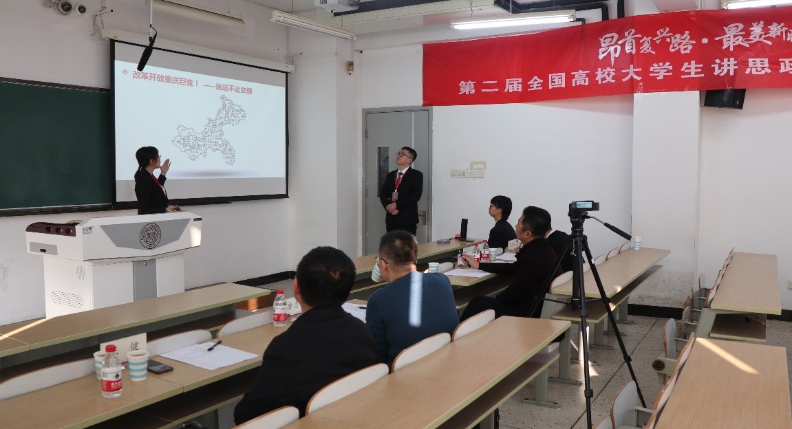 “昂首复兴路·最美新时代”第二届全国高校大学生讲思政课公开课展示活动自2018年6月启动,各参赛队围绕“马克思主义基本原理概论”、“毛泽东思想和中国特色社会主义理论体系概论”、“中国近现代史纲要”、“思想道德修养与法律基础”、“形势与政策”五门课程中的有关章节或专题,以“昂首复兴路·最美新时代”为主题开展教学展示活动,引导学生深化对思政课教学内容的认识和思考,展现新时代大学生的马克思主义理论素养和精神风貌。截止10月22日,共收到104份作品,涉及30个省(区、市)100所高校,其中各省(区、市)提交作品90份,全国重点马院提交作品14份。通过网络展示,专家和学生评委线上打分,共有64份作品获得表彰,14份作品进入决赛。由我校pc28加拿大开奖结果预测官网蒋荣老师指导的材料学院2016级材料科学专业石佳慧和李子言同学主讲的《印象重庆看改革——改革开放是决定当代中国命运的关键抉择》由重庆市教委推荐参赛并入围决赛。